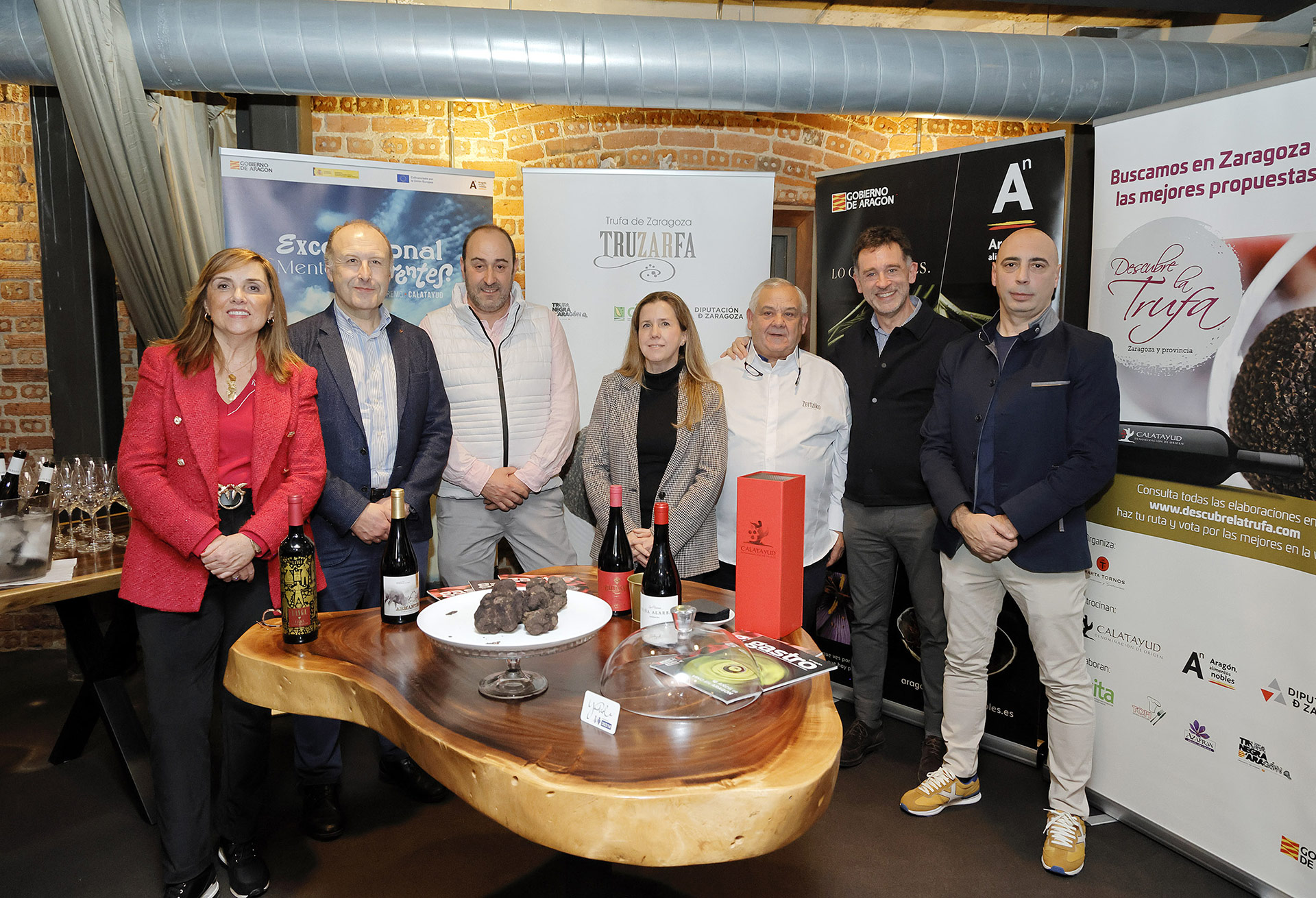 La directora de Promoción Alimentaria del Gobierno de Aragón, Amparo Cuéllar; el director del Área de Empresa y Empleo de Bilbao Ekintza, Javier Álvarez; el presidente de Truzarfa, Jesús López; la organizadora y creadora de «Descubre la trufa», Marta Tornos; el chef del Restaurante Zortziko -estrella Michelin desde 1991-, Dani García; el director de Bilbao Convention Bureau, Kepa Olabarrieta; y el productor y socio fundador de la Asociación de Truficultores y Recolectores de Trufa Negra de las Comarcas de Zaragoza (Truzarfa), con residencia en Bilbao, Fausto Pascual.
